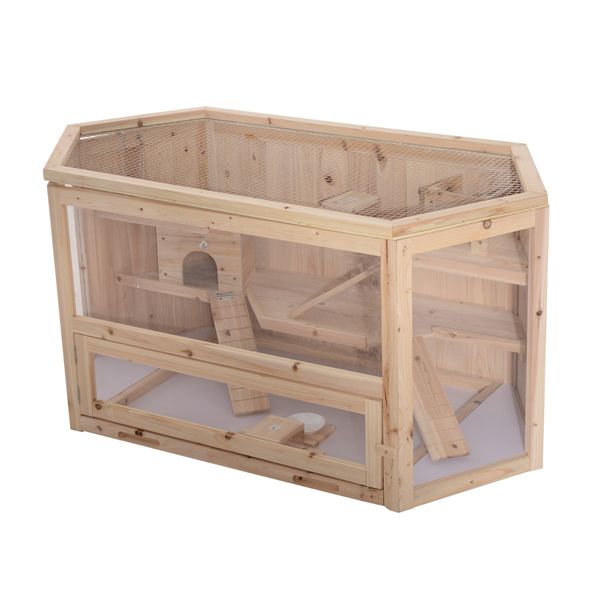 This PawHut cage is the ultimate playground for your small pets to have. offers plenty of room with 3 tiers. Made with natural wood with a mesh top opening this allows for air circulation and is easily accessible to your pets. The front of the cage is has a glass panel for viewing. You can place it anywhere and your little hamsters will have an instant home. The whole unit sits above the floor and is an overall great home for your pets.