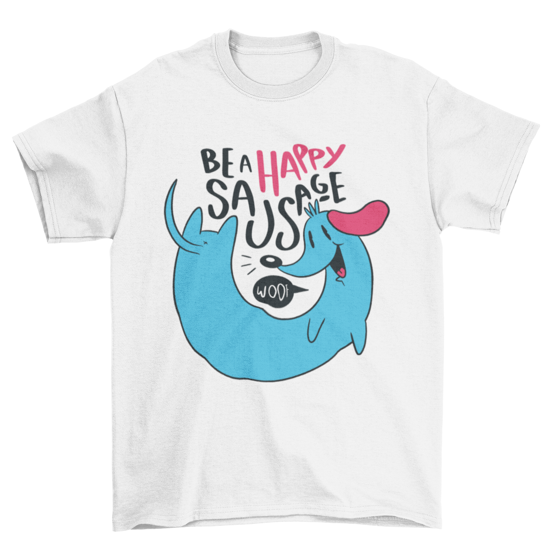 Cute t-shirt design featuring a blue Dachshund dog with the quote "Be a happy sausage".
