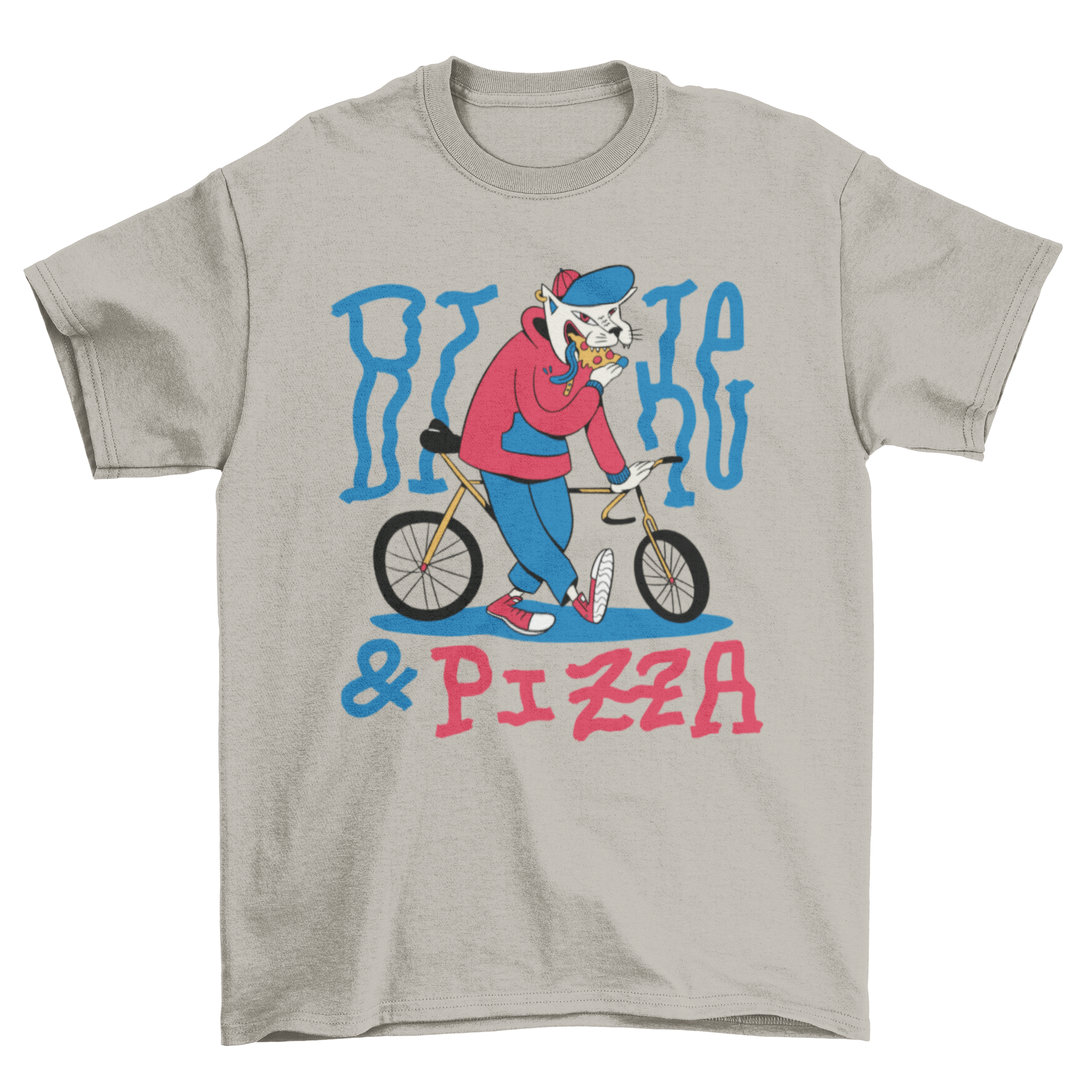 Cool t-shirt design that features a cat eating pizza and holding a fixie bike and the quote "Bike and pizza".